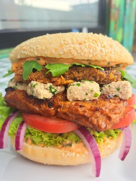 Unser Monatsspecialburger im November ist am Start: Mit BBQ-Soja-Steak, Kräuter-Tofu-Feta, frittierter Aubergine in Cornflakes-Panade, Rucola, Tomate und frischen Zwiebeln.